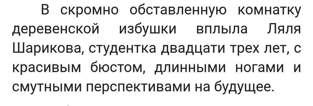 Прямая речь молоденькой продавщицы в обувном магазине: «Чай, не уборщица я». Юноша насвистывает «модный шлягер» — песню «Трава у дома», она же «Земля в иллюминаторе». Шлягер. Не хит. Упомянут матч, где финны вломили чехам, в ту пору еще чехословакам. Герои слушают Мирей Матье, Джо Дассена и «Модерн Токинг». В какое время автор перестал знать реальную Россию?