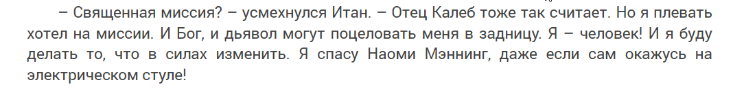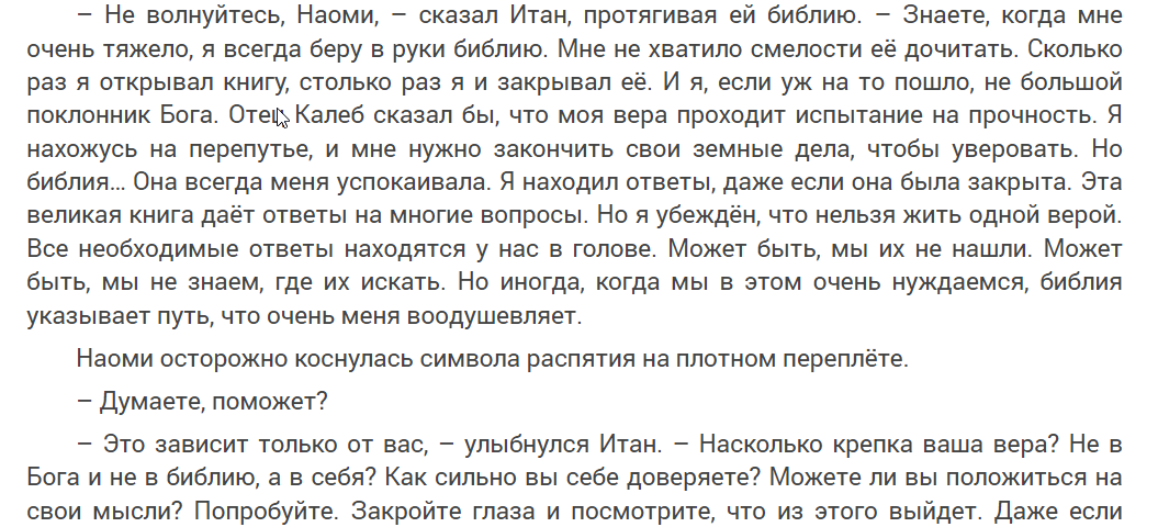 Итак, вторая сторона книги. А вторая сторона книги о Человеке, о Боге и Дьяволе, об ошибках человека, о его слабостях и заблуждениях, которые могут уничтожить в человеке всё человеческое и о его силе, уме и мужестве, о его вере в свои силы и нечто высшее, которое помогает человеку победить эти слабости и заблуждения. Верит ли Итан в Бога? Он уверяет, что нет: