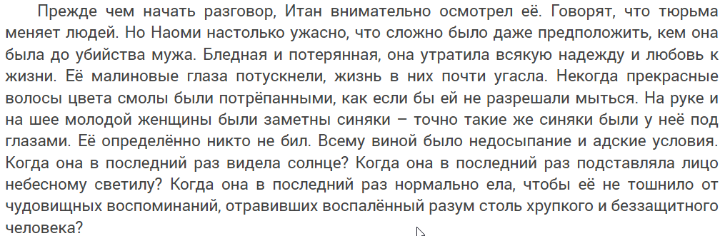 О чём тут речь? Итан в первый раз приходит к осуждённой, в первый раз её видит. НО он откуда-то знает, что у неё были малиновые глаза, прекрасные волосы… Итан не мог этого увидеть, т.к. раньше был не знаком с нею. На мой взгляд, тут перепутался взгляд Итана с авторской речью. Нарушено правило: одна сцена – один фокал.