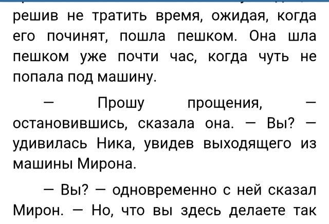 О странностях сюжета. Например, готовность героини взять на себя вину в том, чего не совершала, очень напряг, пришлось перечитывать историю с десятью тысячами евро трижды, и все равно ничего не стало понятным. А впереди, через несколько абзацев, — вот оно, объяснение. Но почему только потом, если читатель не находит себе места на страницу впереди? И это только один пример, а таких можно накидать много, где непонятно, что и почему происходит. Читатель не может понять героев, потому что не может представить такую ситуацию и себя в такой ситуации. Некоторые поступки героини и других персонажей кажутся противоречивыми. Это, повторяясь, потому, что читатель не видит себя на их месте. Он поступил бы иначе. То есть, проблема по-прежнему в том же, о чем идет речь в пространной первой части рецензии. Требуется бОльшая вовлеченность читателя в эмоциональный фон героев, в их характер и мотивацию, чтобы читатель ощутил сердцем, что и почему происходит. И чтобы, даже при несогласии с выбором героев, читатель понял их внутреннюю мотивацию. Это легко решается наращиванием того самого «мяса», о котором неоднократно сказано выше. Пример:
