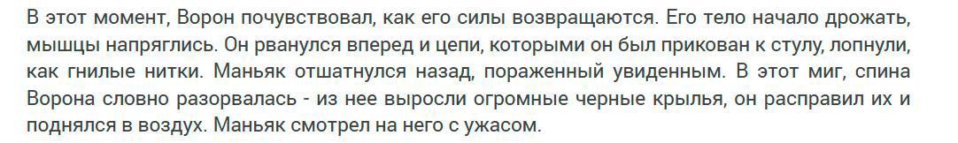 Главный герой повести до определенного момента не имеет имени, и сам он, и окружающие, и автор называют его просто Ворон. Разумеется, без каких-либо пояснений откуда взялась данная кличка. Это просто данность, с которой читатель может лишь смириться. Автор не будет раскрывать до последнего личность своего героя, не расскажет о его прошлом. Оно приоткроется лишь на миг в виде нашедшейся старой фотографии и воспоминаний о детском буллинге. Собственно, последний промелькнет в повести дважды и дважды же станет оправдательным объяснением безумия персонажей. Не собираюсь давать оценку данному приему, пусть, как говорится, останется на совести автора.