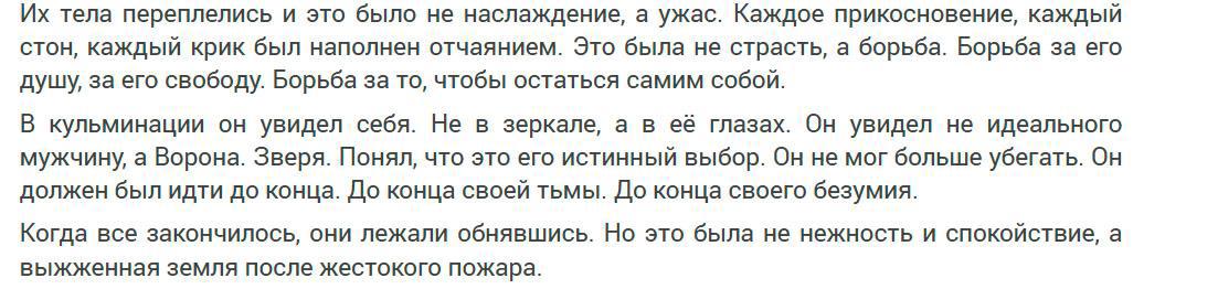 Однако лично мне точно не удается испытать волнения или страха, как и тревогу от синопсиса, в котором чувства и даже происходящее с героем автор пересказывает довольно сухо и быстро. Как не трогают лично меня и эротические сцены-"быстрострелы".