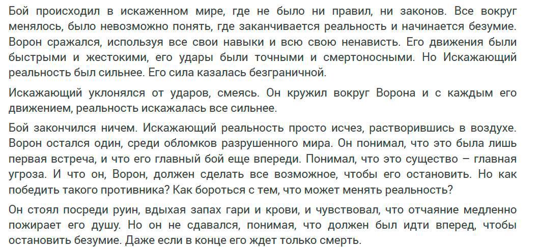 Часто они похожи на лозунги. Впрочем, лозунгов и в самом тексте более чем достаточно. Очередной бой непременно будет казаться герою последним, всякое событие делает Ворона (по словам автора и оценке самого героя) не таким, как прежде. Часто автор прибегает к приему оценки героем самого себя со стороны, а также прочих персонажей: