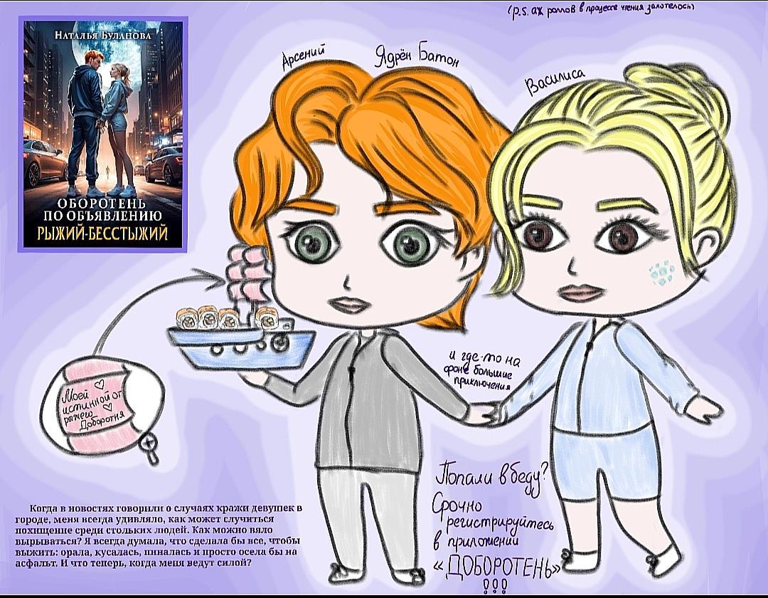 Хочу начать разговор с одного рыжего героя по имени Арсений. Честно говоря, начиная эту историю, у меня из головы не выходил образ некоего мальчика. То есть герой у меня не ассоциировался с таким взрослым человеком, так как и знание его с детства, и его характер, и мелькающие в речи так называемые "слова - паразиты" не давали на это подумать. Не говоря уж о том, что я немного была в шоке от осознания, что ему уже 27 лет. И вот в этой истории можно проследить то, что конечные изменения происходят прямо сейчас. Как и у многих других оборотней, после определённого момента происходит то, что уже будет не исправить. Именно в этот миг можно заметить серьёзность в словах и поступках, умение идти на действия, на которые не все пойдут, ну и желание отстаивать своё, бороться не просто до крови, а до смерти. Не могу сказать, что до этого Арс был каким-то не таким, плохим. Не, он был больше таким, чилловым парнем, любящим грызть столы. А тут, в этой истории, он просто раскрылся, будучи главный героем.