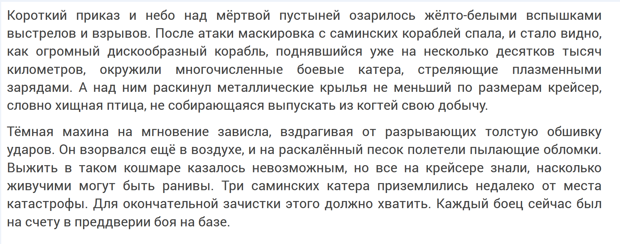 В общем, читаю как Крейсер взрывается в «атмосфере» на высоте несколько десятков тысяч километров (по сути далеко в космосе), причем он сбит другим крылатым крейсером (не понял зачем ему крылья в безвоздушном пространстве). Вот скрин эпизода о котором идет речь.