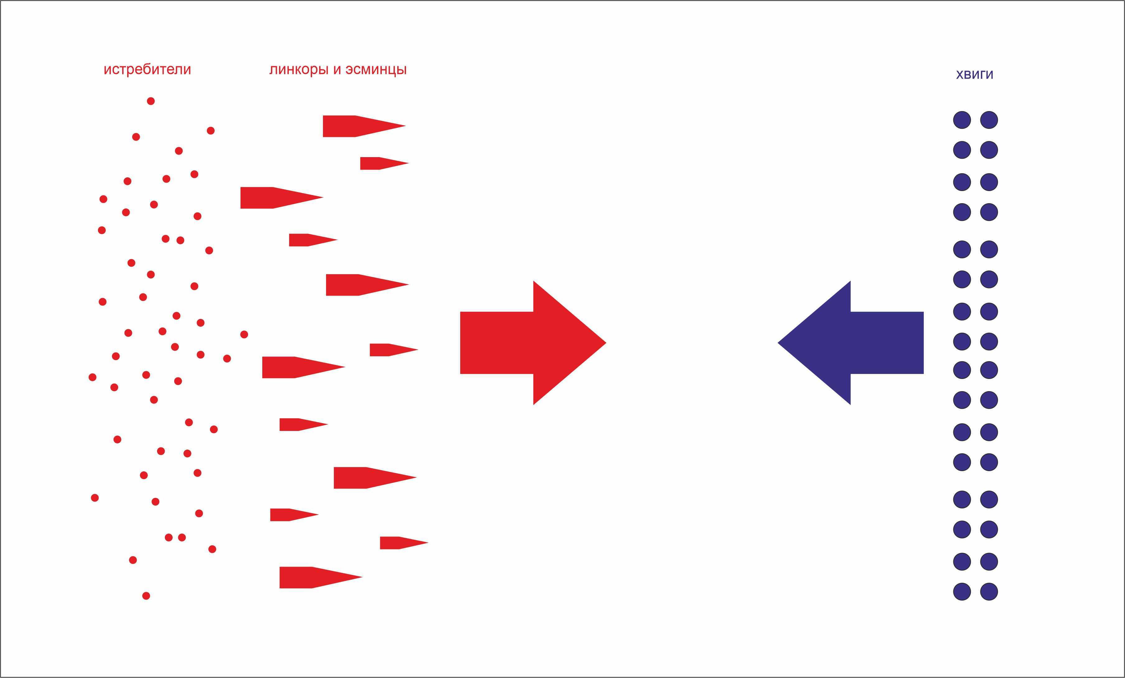 Вспыхивая ракетными двигателями, из линкоров и эсминцев вылетели истребители. Они были двухместными и поэтому спокойно занимали позиции за кораблями, не сближаясь с приближающимися хвигами.