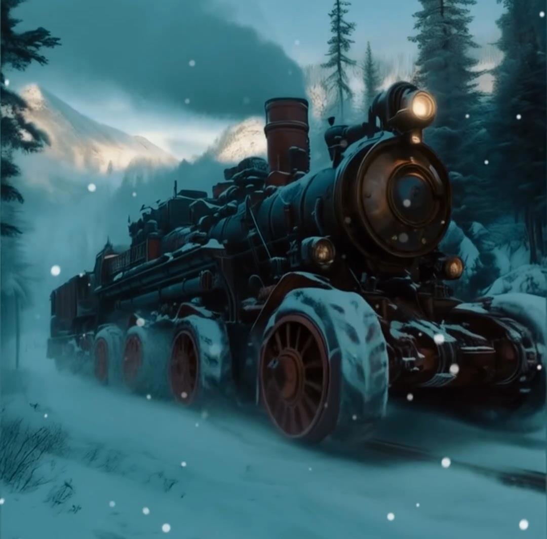 За стимпанковскую атмосферу отвечает вот такой клевый поезд, я подрезала его из авторского буктрейлера:
