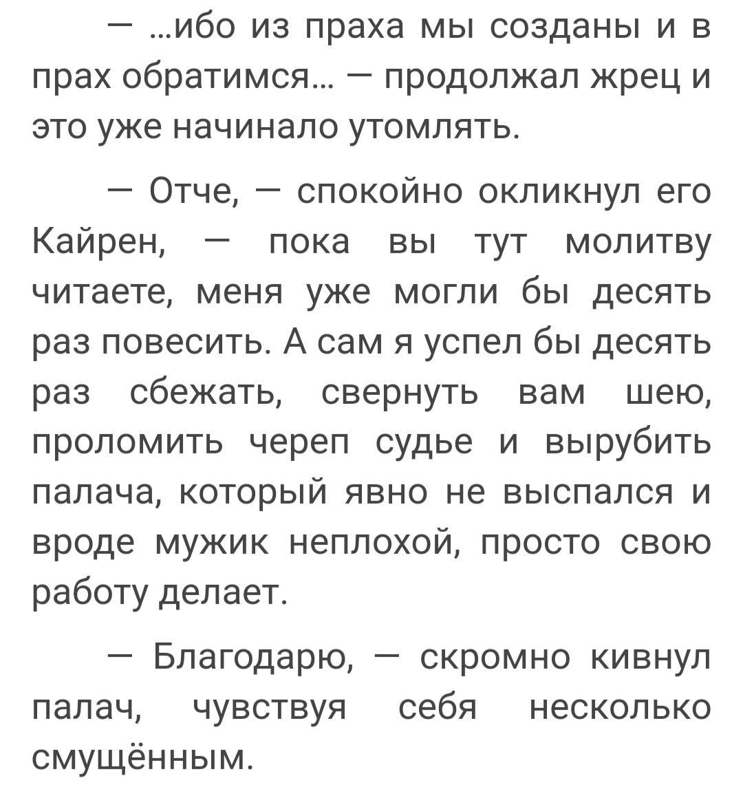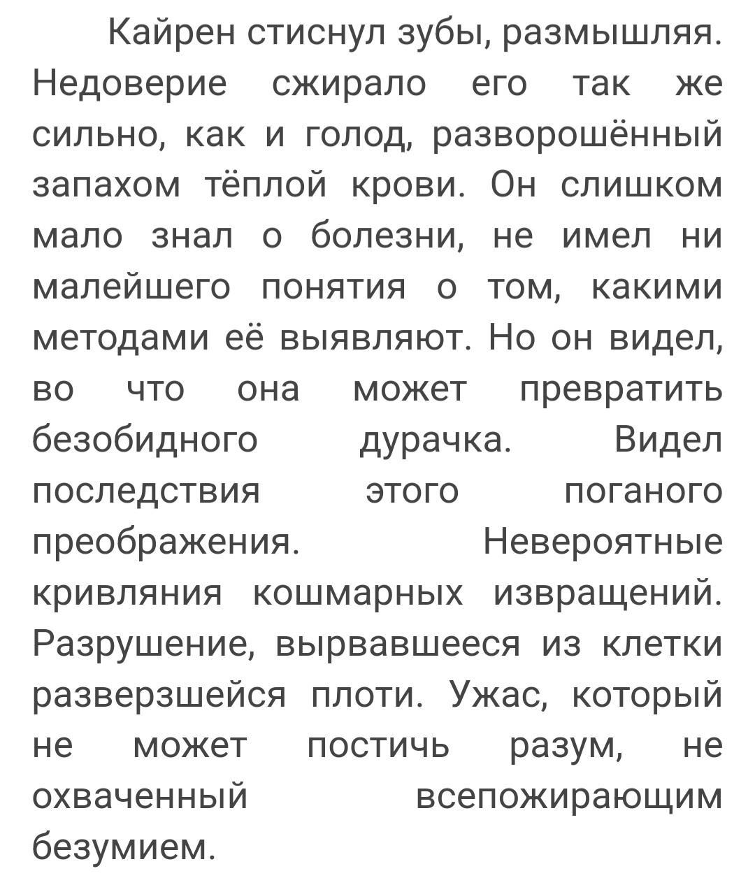 Вот примерно в таком стиле повествование и идет. Чем-то похоже на Лавкрафта и Ко, правда? Но у него там боевки мало, а тут Кайрен вечно кого-то гасит. Местами кроваво.