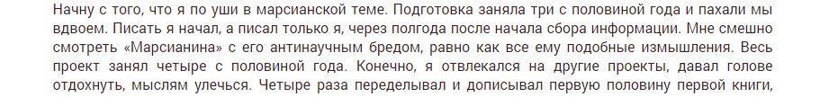 P.S. 21.01.2020 оригинальная рецензия была кастрирована по просьбе организаторов марафона и, сегодня, еще и продолжена. Уверяю всех, что я не хотел касаться того, чего касаться не стоило, но... надо так надо, мы к этому делу привычные. Итак, поговорим о сюжете. В принципе, сюжет этой книги (точнее, двух), как таковой, обрадует любого, кто (как уже указывали другие рецензенты) младше десяти лет и кто обожает читать инструкции ко всему, до чего доберется: к оружию и разведению растений, к поиску мотивов для Президента, чтобы снять с поста министра (уже только из-за одного этого стоит прочесть несколько таких книг!), и устройству атомных станций, к жизненно необходимым Марсу животным и летящим к доблестным героям отобранным с помощью компьютера невестам… Стоп, что-то меня куда-то занесло, к ним инструкция не прилагалась, с невестами герои сами справились. Добавлю, что еще сюжет очень понравится любителям новостей, поскольку, с небольшими фантастическими отклонениями, от начала до конца представляет из себя именно сводку новостей и технических подробностей, перемежаемых вставками, напоминающими, что, вообще-то, произведение ведется от первого лица. Впрочем, о последнем факте мгновенно забывается, поэтому на эту мелочь можно не обращать внимания.