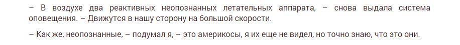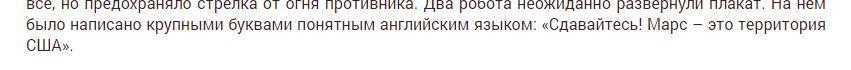 Впрочем, один момент напряг. Не один, конечно, но пример приведу один. Когда с секретной американской базы на Марсе, о которой вся планета Земля и российско-индийская, на треть спонсированная китайцами, прилетевшая на Марс экспедиция и не подозревали, американский челнок высаживает на нашу базу роботов со стрелковым оружием, то происходит следующее: