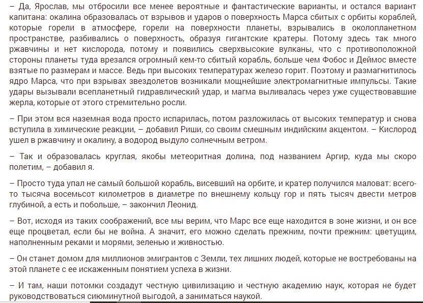 К тому же – про колонизацию Марса. Две мои книги тоже эту тему затрагивают, и надо, думаю, приобщиться к новой информации и другому (и с этим я тоже угадал!) способу подачи. Приобщу еще один шедевр в коллекцию, куда вошли трилогия «Красный Марс», «Зеленый Марс», «Голубой Марс» от Кима Робинсона, «Марсианские хроники» Рея Бредбери», «Прикладное терраформирование» Катласа, «Пески Марса» Артура Кларка, «Марсианка Подкейн» и «Красная планета» Хайнлайна, «Моряки вселенной» Анибала, «Звездоплаватели» Мартынова, «Марс пробуждается» Константина Волкова, «Полдень XXII век» Стругацких и многие-многие другие, чисто по теме и около того. «Нашего полку прибыло!» – обрадовался я, приглушил РенТВ, где показывали какую-то муть, и сел за чтение.