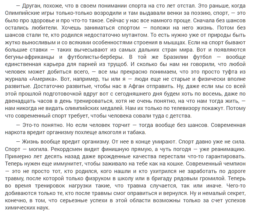 Выше я уже касался вскользь динамики — в первой половине произведения она оставляет желать лучшего. Все тонет в монотонных диалогах с разной степенью философичности. И даже обсуждение допинг-порошка с милиционером скатывается в лекцию от последнего что это за вещество такое.