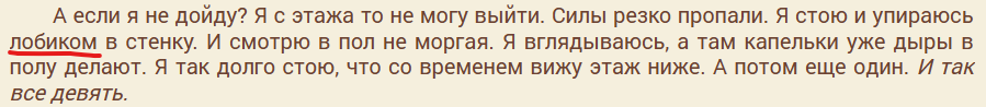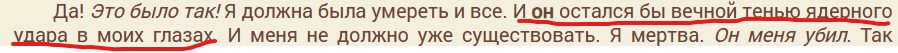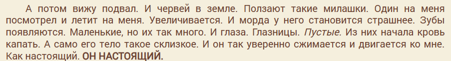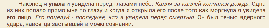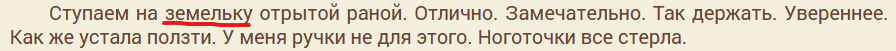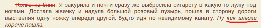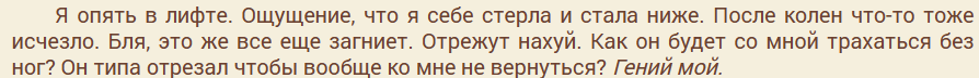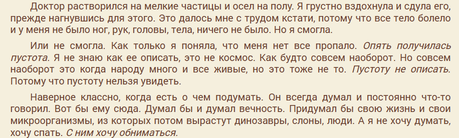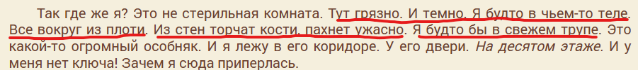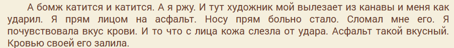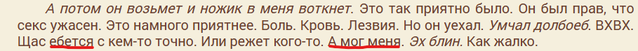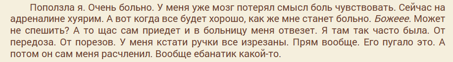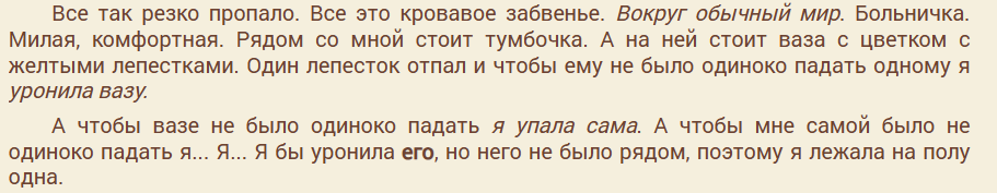 (А почему так мало уменьшительно ласкательных? Непорядок! Вот идеальный абзац: Падаю. Сердечко колотиться. У меня расстегнулся лифчик и я посмотрела вниз. Конечно он и титечки изуродовал. Столько шрамиков. Там какая-то гниль коричневенькая. И все равно она не полностью отрезана и все еще красивенькая. Или вообще некрасивенькая. Страшненько
