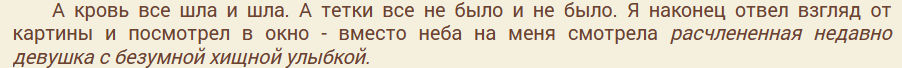 Какая кровавая эстетика?! Она у тебя проявляется только в словах «кровь» и «резать». Как глубоко и красочно