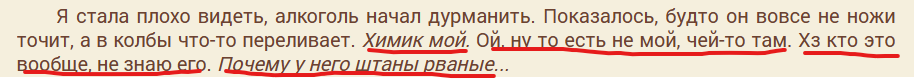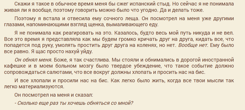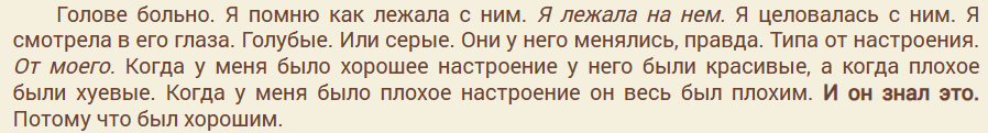 Твой комментарий, под первой рецухой, выглядит как наспех написанное оправдание. Все мы ищем баланс между тем, чтобы писать с удовольствием для себя и "с интересом" для читателя. Пишешь только для себя — получается хуйня. Может быть, этот текст способен понять только «приближенный» человек, который знаком с твоей личной жизнью, но ты опубликовал его в публичном доступе, так что извольте хавать критику.