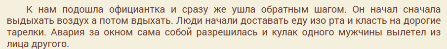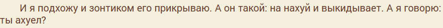 (Ха-ха-ха! Ебучие зонты... Смешной кусочек, который, повторюсь, никогда лишним не бывает, вне зависимости от жанра и целей автора на создание определенной атмосферы)