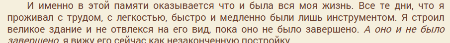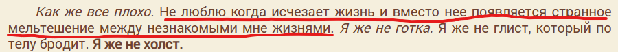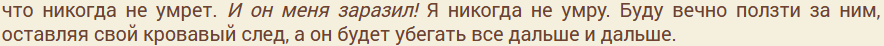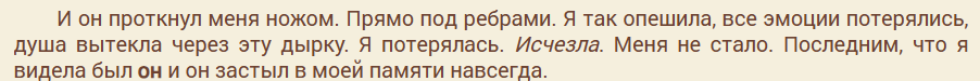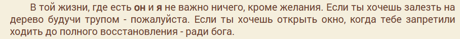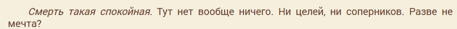 (Опять хороший абзац. Дает какую-то информацию (которая может зародить сомнение у читателя на счет смысла происходящего) про персонажа. Интересное рассуждение про смерть)