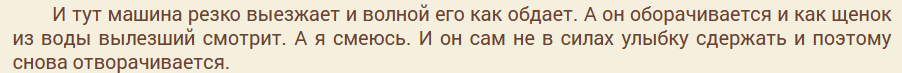 (Образно и мило. Хороший пример того, как можно справиться без уменьшительно-ласкательных слов, которые на самом деле только раздражают. «Как щенок из воды», «и он сам не в силах сдержать и поэтому снова отворачивается» — прямо хорошо)