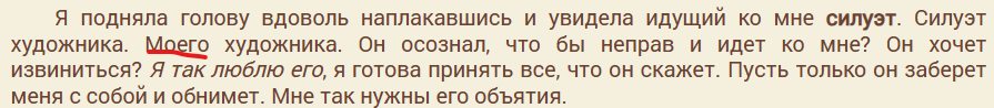 (Мой-мой-мой! Ее навязчивая мысль, что художник — ее собственность (а именно такое впечатление у меня сложилось от прочтения), не кажется проявлением безумной бабы, а смотрится как проявление тупой скучной пизды, которая озабочена лишь тем, чтобы понравиться мальчику своей легкомысленностью и дешевой привязанностью, которая выражается в слове «мой».