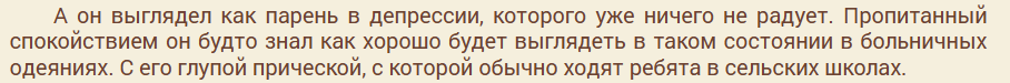 («А он выглядит как парень в депрессии, которого уже ничего не радует» — нахуй это «в депрессии», просто парень, которого ничего не радует, я и сам догадаюсь, что он в депрессии... Описание хорошее)