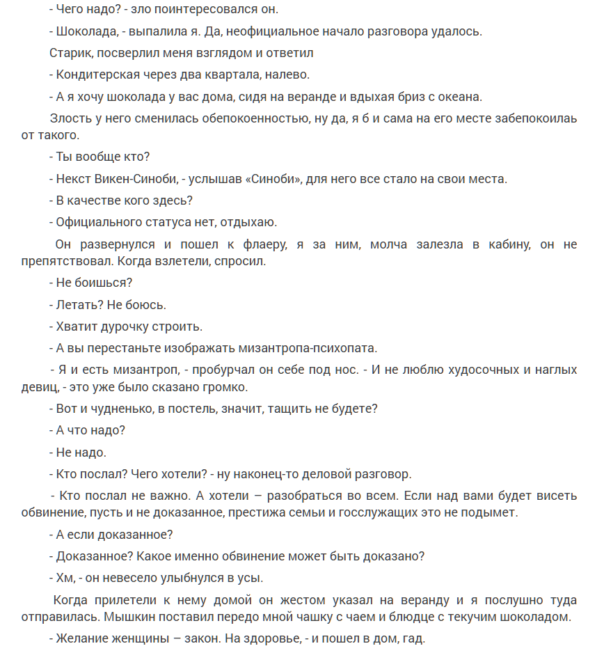 Если же закрыть глаза на технические огрехи, то слог вполне легкий, что способствует высокой динамике текста, и он не лишен красивостей и атмосферных моментов.
