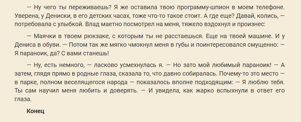 Психология отношений — Секс ГГ в парилке с Владом описан без натурализма и психологически выверенный без пошлости. Расставание с Владом в 58 главе тяжёлое и почти естественное. И похищение Дениски сына Влада в 59 главе психологически выверенное. Ковалев Игорь директор спортклуба в котором занимается Алена организовал похищение Дениски. Весьма сложный клубок взаимоотношений с Матвеем, с Потоцким, со Светланой. Автор использует на все сто процентов мужскую психологию отношений. Не опускаясь до женской первобытной пещерной психологии: ты меня любишь? А я красивая?