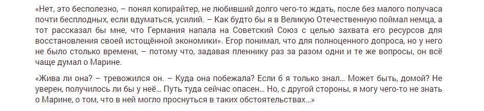 Итог. Бывают книги про детей, которые нужно читать взрослым (тот же Сэллинджер во ржи), и книги про взрослых, при чтении которых читатель снова погружается в детство и оказывается среди играющих в «войнушку» приятелей. И вновь каждая минута жизни – новое приключение, невозможное даже возможно (причем, абсолютно беспричинно, лишь потому, что игрокам так захотелось), а героев нельзя убить, потому что «плохими» назначены другие – вот их, родимых, можно кромсать сотнями и пытать оголенными проводами, при этом нежно думая о любимой, нисколько не отвлекаясь на запах паленого мяса: