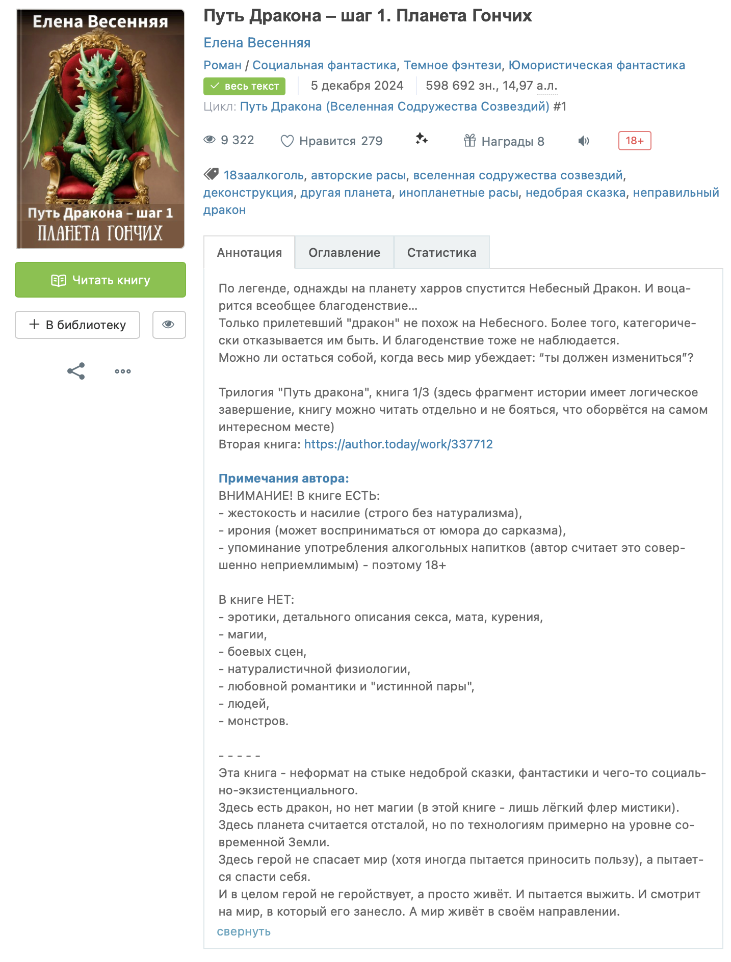 - Авторские расы, Деконструкция, Другая планета, Недобрая сказка, Неправильный дракон, Юмористическая фантастика — по содержанию совпадает.