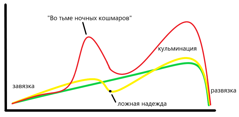 Грубо говоря, из-за резкого скачка напряжения в первой половине затем получается немного гипертрофированная «ложная надежда», которая снижает интерес к дальнейшим событиям.