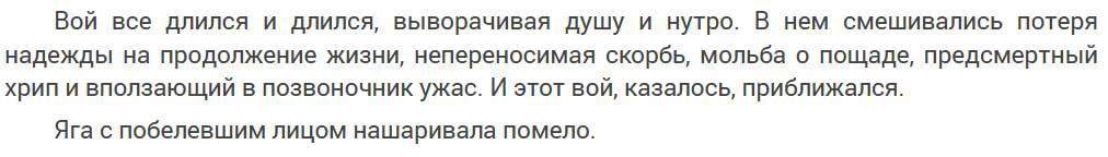 - И третья повествовательная часть отходит "светлым", которые занимаются мудачеством в каждой строчке, попутно соревнуются, кто из них большее чмо моральное. Давайте так: чтобы разозлить читателя и дать ему нужную эмоцию, много ума не надо. Приём "спаси/убей собачку" всё ещё рабочая схема, но он должен быть рассчитан и на протагониста тоже - тогда оно заиграет. Меня, как читателя, не надо каждый раз настраивать против "светлых", они с первых строк мудаки без права на обжалование, так что не надо по десять раз эту тему обсасывать. Это выглядит как раздувание хронометража, просто чтоб было. Ни тебе новой информации, ни смена приоритетов, ни интересных подробностей, чтоб происходящее не казалось однозначным - просто умножение того, что и так работает.