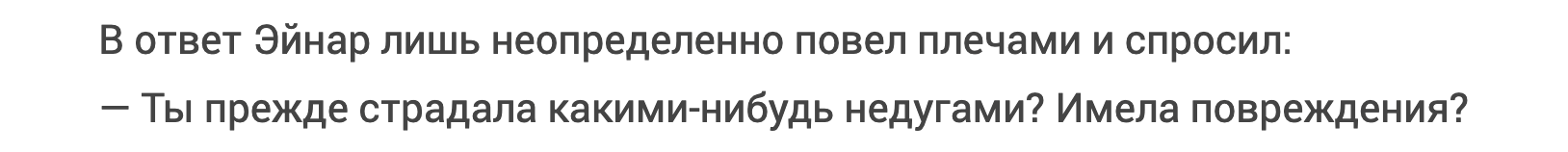Читателя сразу встречают главные действующие лица — Эйнар, врачующий деревенских жителей, и Майре, несчастная жертва насилия. Поначалу Майре вызывает искреннее сопереживание: бедная девушка, оказавшаяся не в то время и не в том месте; а Эйнар представляется эдаким спокойным, уверенным в себе и добросердечным целителем. Но не тут-то было! Честно говоря, даже не хочется спойлерить и рассказывать, кто они на самом деле — скажу только, что оба сбрасывают маски по два, а то и по три раза. Эйнар на поверку оказывается не таким уж добродушным, а Майре — не такой уж слабой и беззащитной.