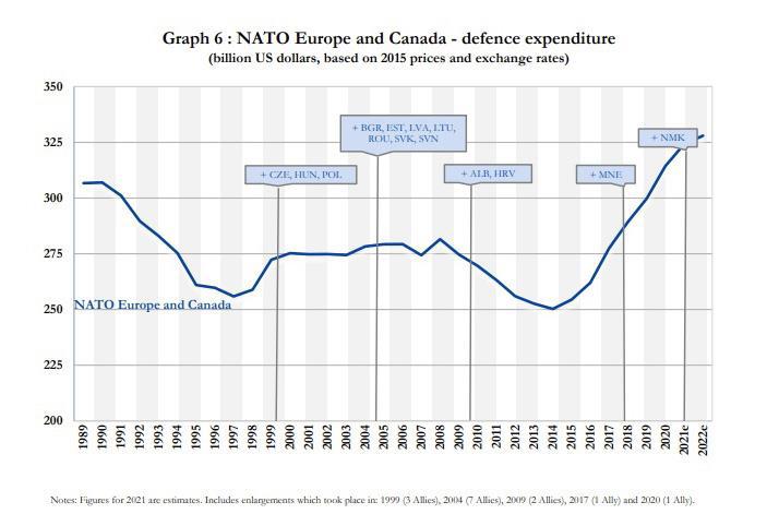 Перед вами график трат на оборону стран НАТО по годам. Как вы видите на графике, страны состоящие в оборонительном альянсе тратят меньше денег на оборону, когда никакая страна с империалистическими амбициями под боком, им больше не угрожает, ибо это не несёт в себе смысла. Прямо как в далёкой-далёкой галактике, где не нужны были тяжёлые разрушители, а нужны были лёгкие корабли, для того чтобы космические погранцы, космических же пиратов гоняли. Но вернёмся к цифрам, и посмотрим что происходит потом... Ой! в 2014 году график пошел вверх... а что случилось? Ааа! Госдеп опять наверное, козни начал строить. Уххх они бля...