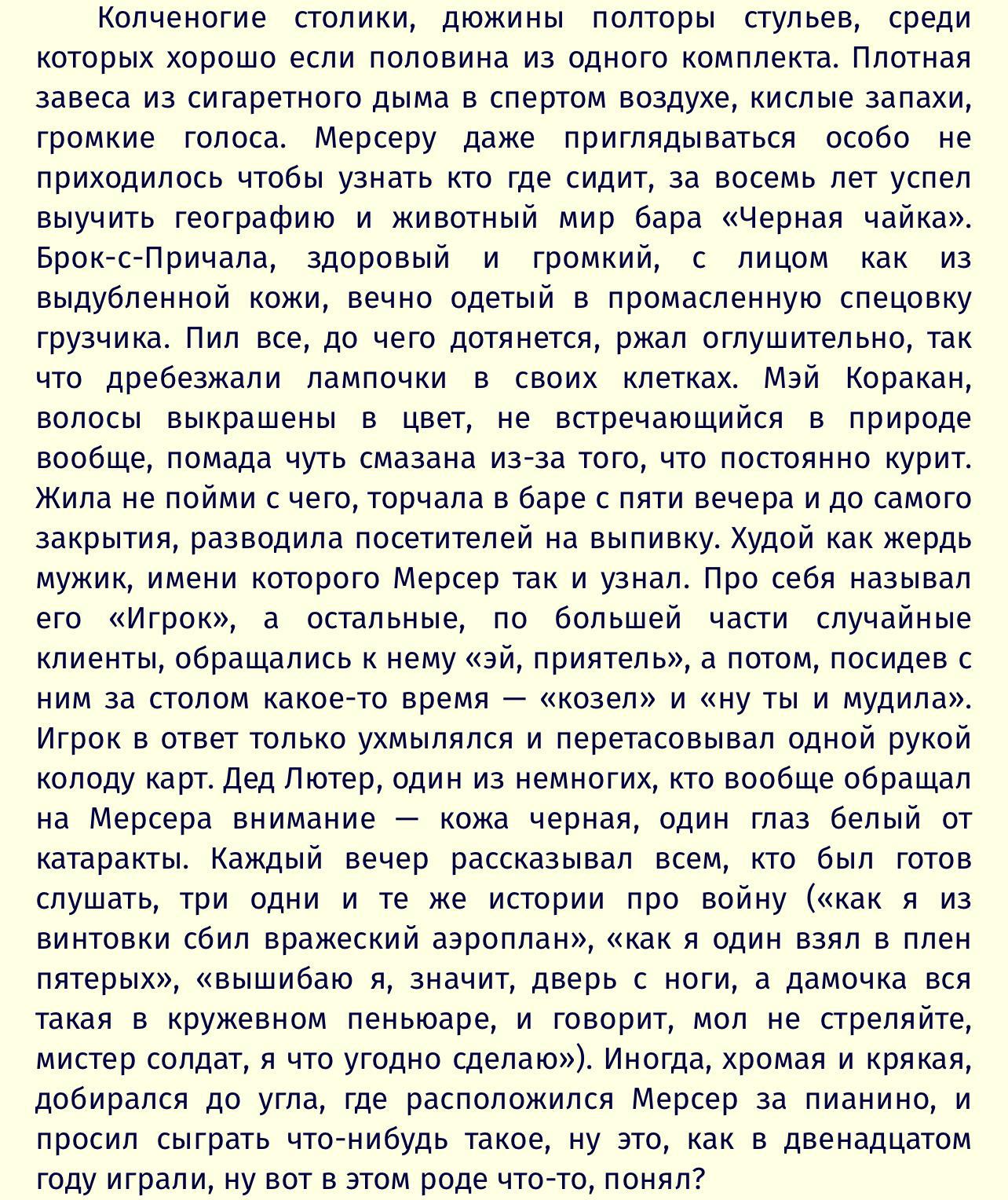 так что и у Евгения я осталась. Мерсер - главный наш герой, как уже по отрывку понятно - музыкант с... ну, потом выясняется, каким прошлым. мне так хорошо стало. потому что... оно напоминает, что все мы в чем-то неудачники. и это... ну, это жизнь. это нормально. и вот примерно такое ощущение и оставляет вся история. кто-то приходит, кто-то уходит, кто-то делает странное, кому-то становится все равно. раз он чувствует что-то, потом снова ничего... и это - без моих вечных идеалов феи-русалочки - это норм. селяви и все такое. и в этом есть суровая... красота? как-то вот что-то такое.