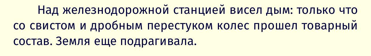 невероятное ощущение присутствия. к происходящему ни состав, ни подрагивания земли отношения не имеют, а вот же - два предложения, и ты уже там.