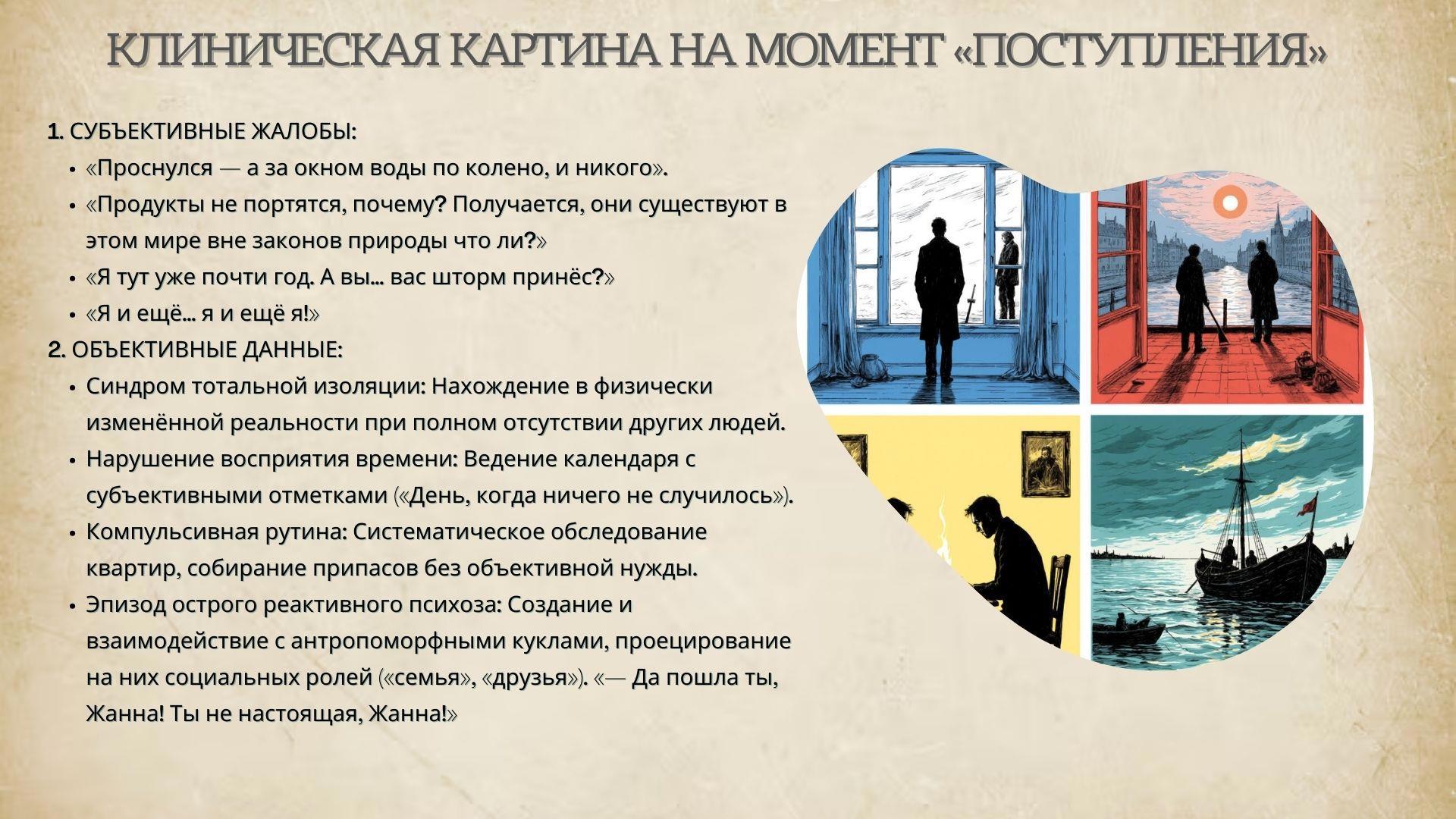 Особого внимания заслуживает то, как автор показывает постепенную трансформацию героя — от растерянного человека, пытающегося понять правила нового мира, до существа, создающего себе воображаемых друзей и семью.