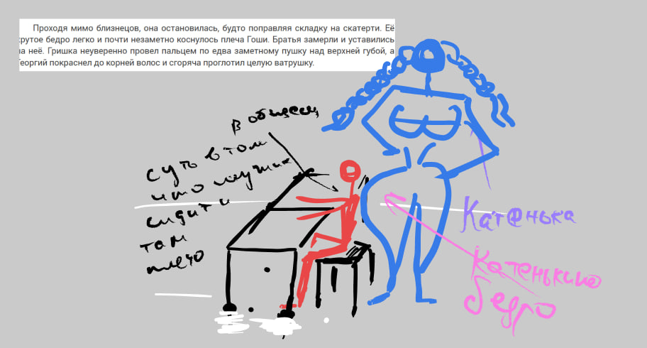 «Проходя мимо близнецов, она остановилась, будто поправляя складку на скатерти. Её крутое бедро легко и почти незаметно коснулось плеча Гоши. Братья замерли и уставились на неё. Гришка неуверенно провел пальцем по едва заметному пушку над верхней губой, а Георгий покраснел до корней волос и сгоряча проглотил целую ватрушку»