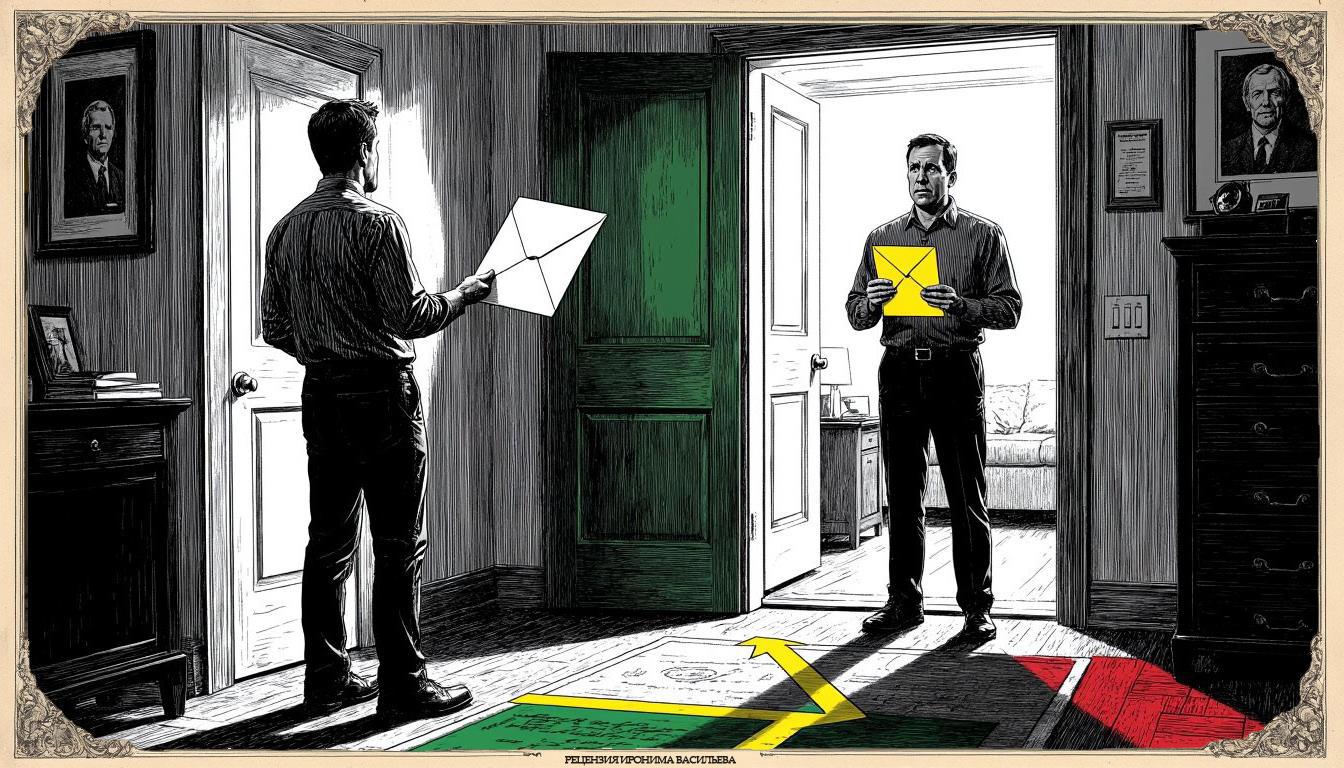 ДАРЬЯ ПЕТРОВНА: Родимые… Я в коридоре прибиралась. За шкафом этот конвертик нашла. Лежит, пылится. На нём ни имени, ни адреса. Только печать какая‑то… зеркальная. И шелестит он, как сухие осенние листья. Или как пластиковый лист в конверте государственном… Вы уж извините, я, пожалуй, его в печку. Без чтения. Мало ли чего. Всякое, говорят, в таких конвертах бывает. И нервы потом не у всех выдержат, как у того Патрика.