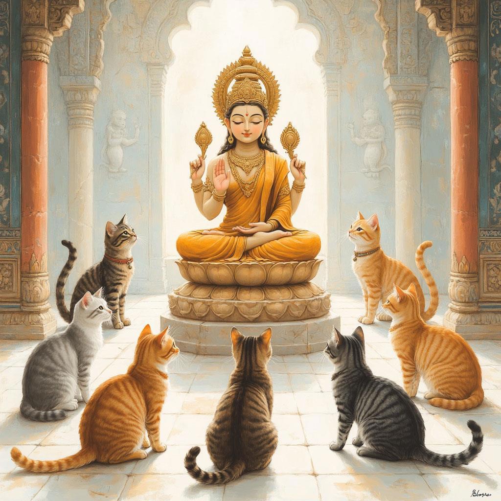 Через образ богини Шаштхи и её священных кошек раскрывается фрагмент индуистской мифологии и народных верований.