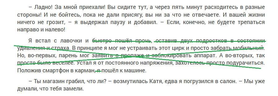 Мне лениво всё принскринить. поэтому скажу вывод: это не художественный текст, но так называемые байки на завалинке или мальчуковая пурга, которая достаточно аутентично передает рассказ вышеупомянутого прот=летария о своих приключениях стилем: а я ему бац! А он мне с ноги хрясь! А я поднырнул и ему в рыло херак!