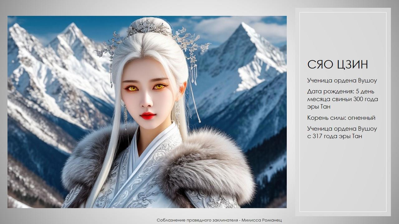 Главная героиня Сяо Цзин интригует с первой главы тем, что её принимают за проклятую из-за ее необычной внешности — седых (белых) волос. Она приходит в орден Вушоу, чтобы стать заклинательницей. И начинает там обучаться.