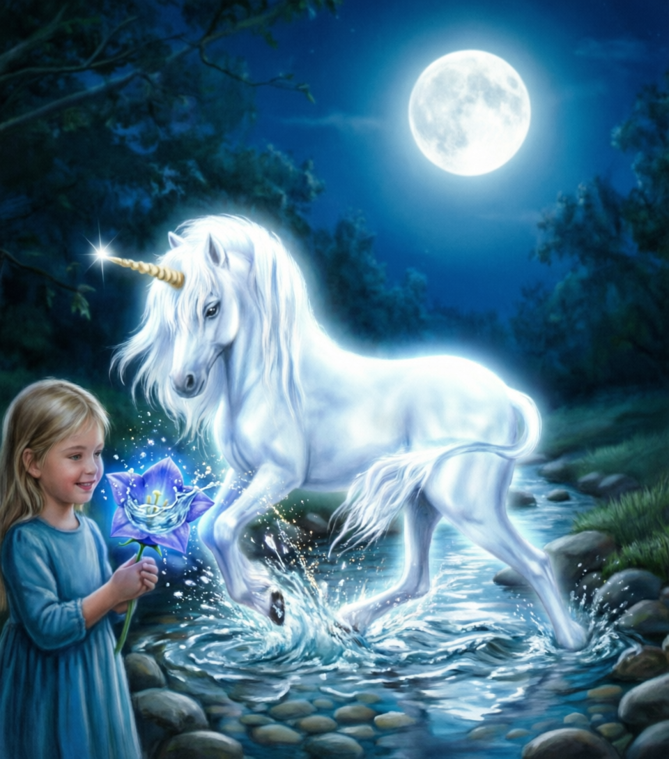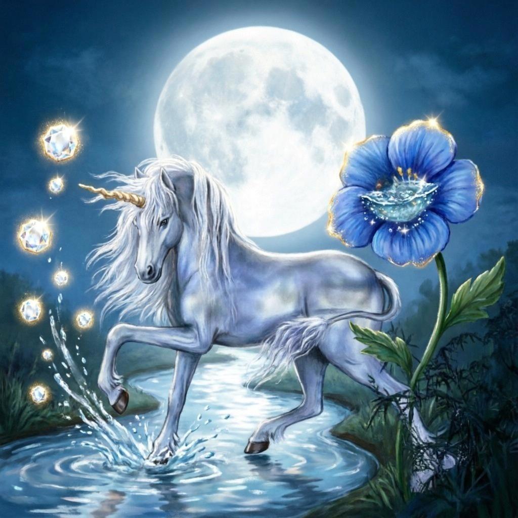у самой воды стоял и бил копытом землю единорог. Тот самый! Он будто светился изнутри, а искрящиеся в лунном свете брызги разлетались по всей поляне.