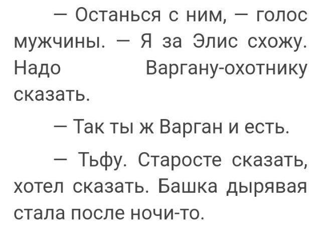 Например, первая глава. Разговаривают Варган и Элис. Варган сказал Элис, что пойдёт за Элис, и забыл, как его самого зовут. Если честно, я не понял, как так...