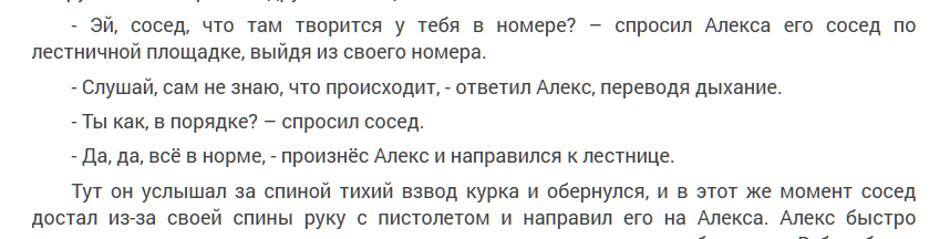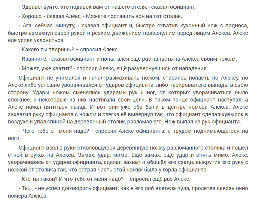 Это произведение очень похоже… на синопсис? Нет. Для него оно слишком большое. На сценарий? Вот это уже ближе к истине. «Алекс Хорм» очень напоминает сценарий крутого боевика с фантастическим элементом. К сожалению, логика в нем пребывает за гранью той же фантастики. Спасти ситуацию могли бы раскрытые образы персонажей, но и этого здесь нет. Есть лишь крайне низкий уровень грамотности и попытка завалить все экшеном, что превращается в сумбур.