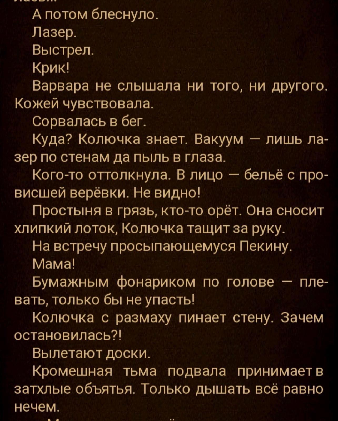 В книге прослеживается авторский стиль, имеется грамотное изложение. Большей частью язык красочный, ясный, без излишеств. Я редко встречаю тексты, откуда не хотелось бы надёргать фраз в назидание, здесь – не хочется. Ну, встречаются неблагоприятно созвучные, типа сгущёнка-варёнка, однако, я допускаю, что такие созвучия должны нести в себе определённый смысл. Основной минус стилистики текста с моей читательской т.з. заключается в неравномерности повествования. Вот идёт оно, размеренное, подробное, с описанием вкусов, запахов и звуков, и вдруг, в тот момент, когда следует описание боёвки, автор срывается в пунктир-точка-точка-пунктир. Привожу пример, простите, что картинкой, читала то с телефона, то с ноута: