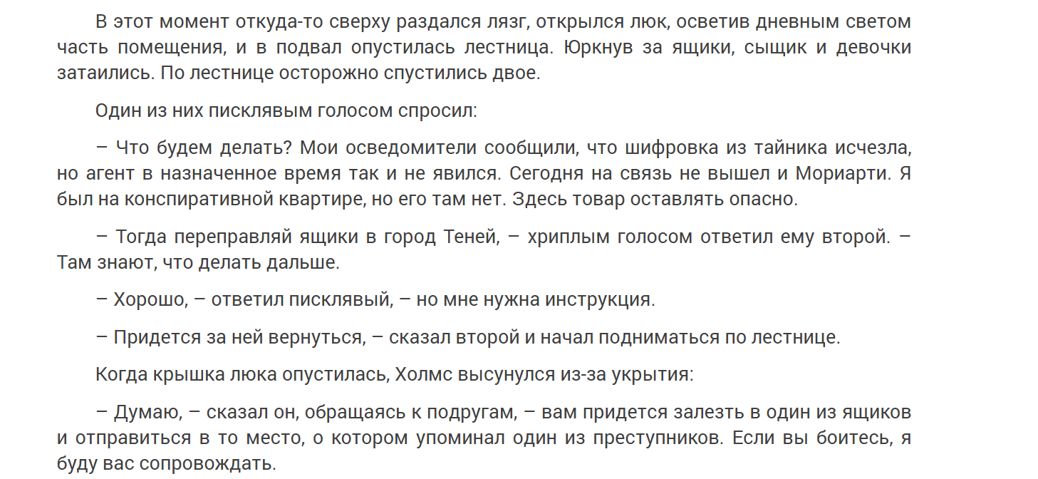 У меня возник вопрос, а куда делся первый злодей? Почему Холмс спокойно стал разговаривать с девочками, советуя им залезть в один из ящиков. Почему этого не видит и не слышит оставшийся злодей? Ведь ящики же освещаются фонариком, да и злодей как бы должен смотреть и направляться в их сторону. Лично для меня это вышло немного наигранно. И этот момент стал для меня единственным в книге, в который мне верится с трудом.