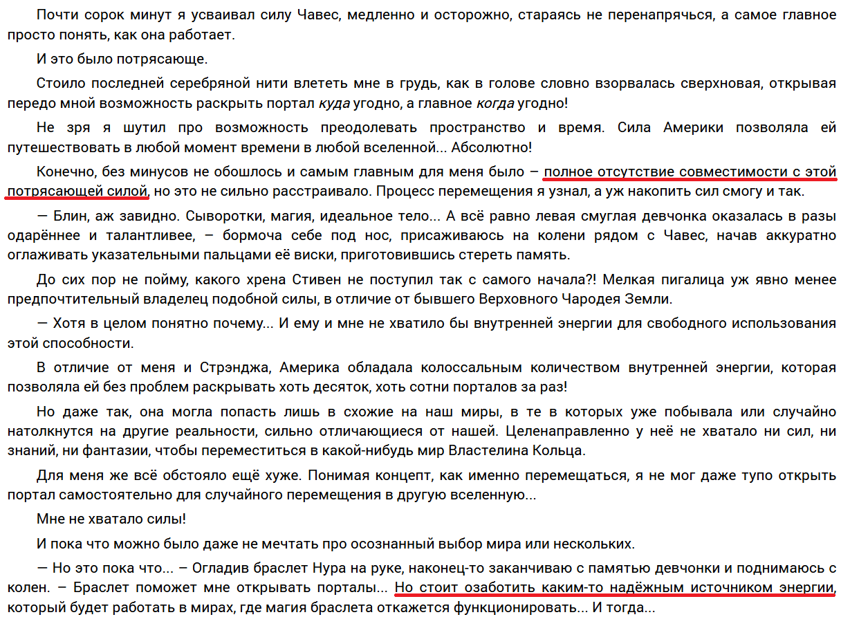 По этой силе плавающий канон, который не указывает, откуда именно Америка Чавес берёт энергию для перемещений. Чаще всего другие авторы фф используют "внешний" источник, тут же указана некая "внутренняя сила" (хотя маги в Марвел как раз все сидят на внешних источниках, а собственной энергии у них с гулькин нос). Тут как кому больше нравится.