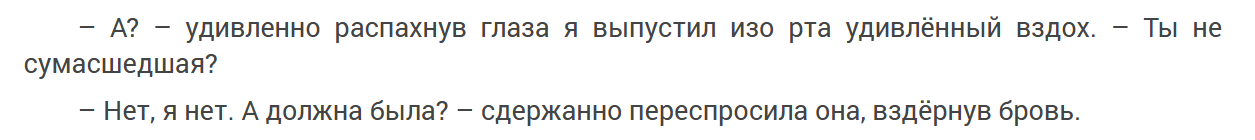И да, ты прав, это буквально "Are you mad?", я уже не раз говорил, что не читаю ничего из русскоязычного, а провожу ну очень много времени на анг ресурсах: книги, фики, фильмы, аниме, ютуб (особенно ютуб) всё на инглише. И за 5 лет такой жизни к этому времени примерно четверть моих мыслей на английском. И мне приходится их как-то переводить. Очень раздражает, когда ведешь с кем-то жаркий спор и нужно тратить лишние секунды, чтобы перевести собственные мысли, чтобы меня могли понять.
