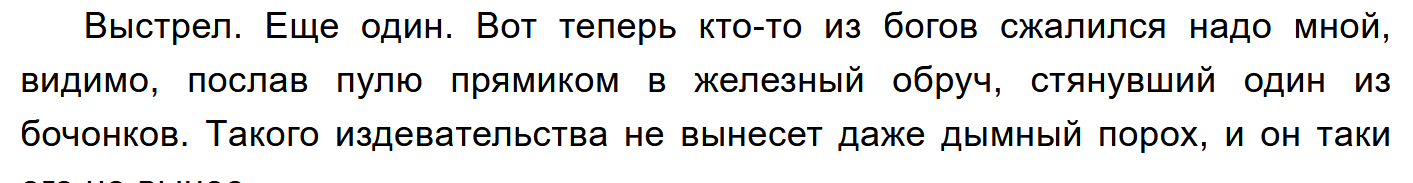 Как раз таки из-за "видимо" я и заклинилась!!! Прошла бы мимо даже не зацепившись, не обрати автор мое внимание на то, что первые два выстрела были не результативными и лишь третий, попавший в железку, взорвал порох. Пусть я тупая блондинка, но прочитала уже десятки книжек про всякие фитили и аркебузы и везде порох ПОДЖИГАЮТ, стреляя. При помощи фитиля, кремния, зубила или чьей-то матери, но ПОДЖИГАЮТ! Только третья пуля, ударившись об железку (автор прямо ткнул меня в это носом!), подожгла порох... Или КАК (!?), если свинец искр не дает?? Я понимаю, что что-то недопонимаю, но вот перемкнуло мну и все! )))) Зачем тогда про обруч было писать?