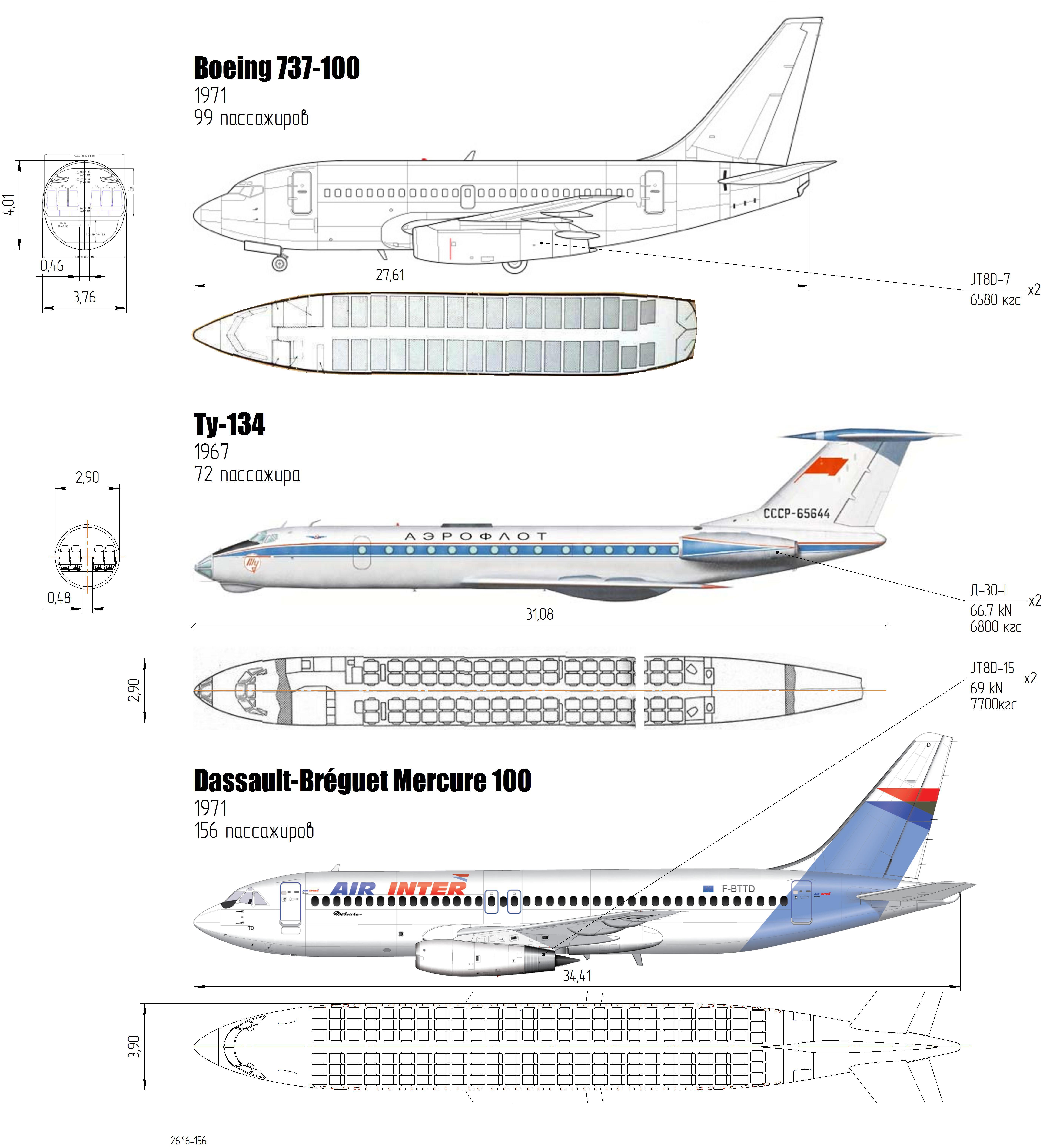 Вот к примеру Ближнемагистральные пассажирские самолеты, вошедшие в эксплуатацию в начале 1970-х с примерно одинаковыми двигателями