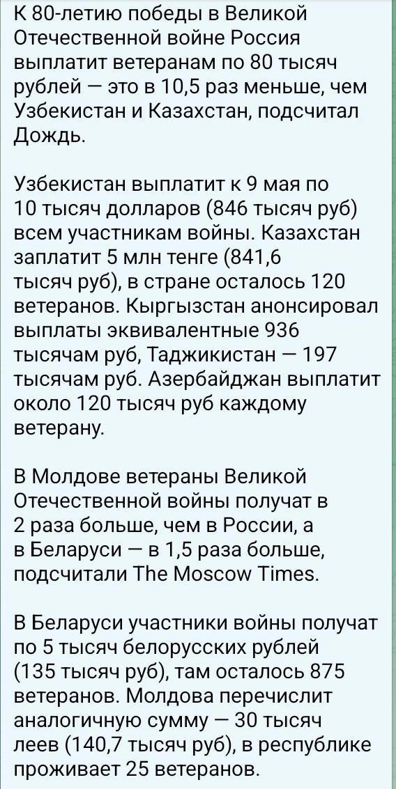 Степан Степанов сегодня 10.05.2025 в 05:01 Новый Вы все врете' -это классика,а проверяется просто.Есть указ пыни о 80 тысячах,таки есть.и например узбекский,тоже есть такое постановление.,таки да А Владимир Ильич свою 'Искру" ,тоже не в Саратове издавал,и ничо,да и денежку брал ото всех ,хто давал.....